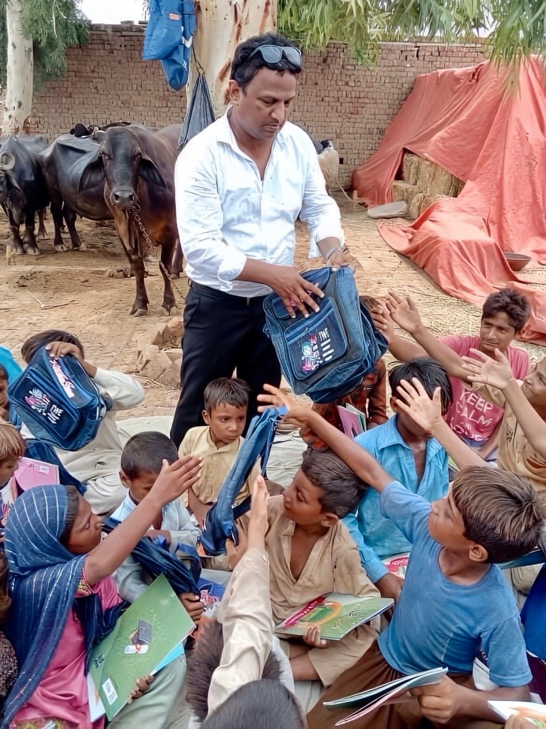 Shaffaf, co-founder of the Freedom School System and superintendent of our KASUR schools.Nadeem hands out book bagsOur first little brick yard school comprised of 15 children. Now a year and a half later more than 670 of the poorest of villages and children in bonded labor are being taught by 17 teachers in brick yards and villages..Look closely to the front, and the girl with her arms around her younger brother, and the boy with his arms around his younger sister.